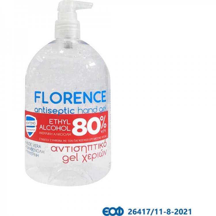 Βιοκτόνο Αντισηπτικό και Απολυμαντικό Gel Χεριών Florence, εγκεκριμένο από τον ΕΟΦ και με σύνθεση σύμφωνα με τον Παγκόσμιο Οργανισμό Υγείας.
